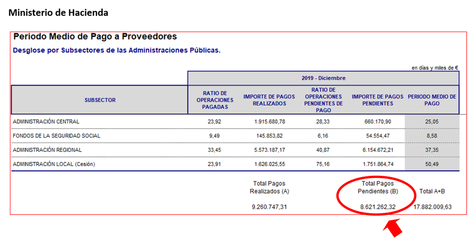 Asimismo, la PMcM ha consultado los periodos medios de pago de las AA.PP durante diciembre 2019, que el Ministerio de Hacienda acaba de hacer públicos. En ellos se detalla que se realizaron pagos en diciembre por importe de 9.260 millones de euros y que quedaron pendientes de pago (excediendo los plazos legales) facturas por importe de 8.621 millones de euros.