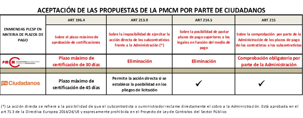 En cuanto al plazo máximo de aprobación de certificaciones, Ciudadanos lo fija en 45 días frente a los 30 de PMcM. Y en lo referente a lo que plantea la PMcM sobre eliminar el ejercicio de la acción directa de los subcontratistas frente a la Administración, Ciudadanos propone permitir la acción directa si se establece la posibilidad en los pliegos de licitación.