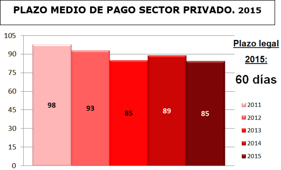 - El plazo medio de pago a proveedores se redujo tanto en el sector público (8,5%) como en el privado (4,5%), pasando respectivamente de 82 a 75 y de 89 a 85 días, aunque manteniéndose lejos de los 30 y 60 días que establece la ley