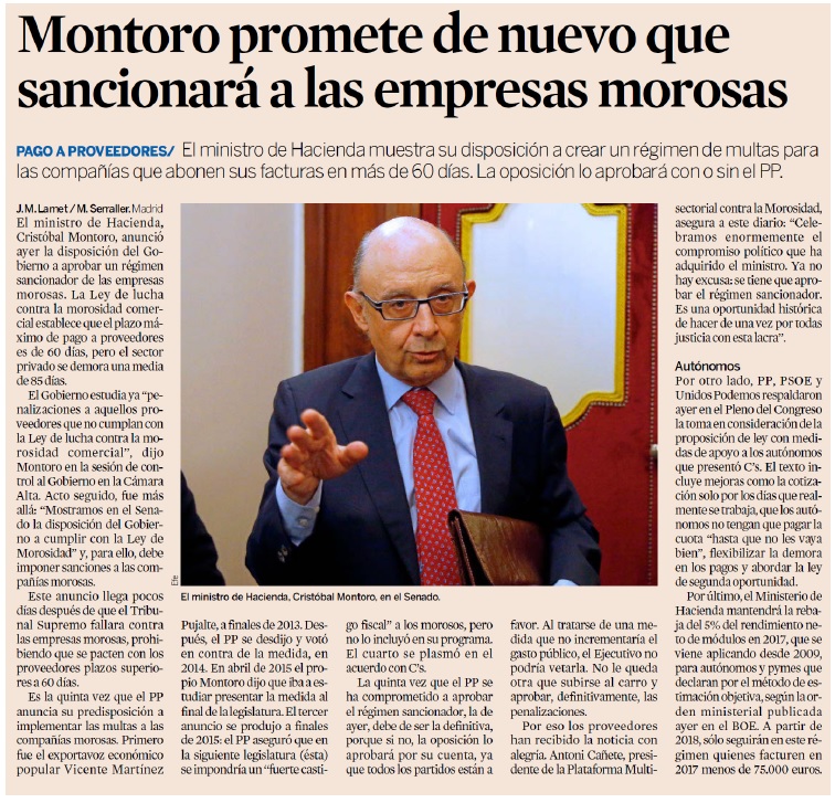 El Ministro de Hacienda muestra su disposición a crear un régimen de multas para las compañías que abonen sus facturas en más de 60 días. Estimados amigos, os adjuntamos la noticia publicada hoy en Expansión, con las declaraciones del Ministro Montoro sobre el Régimen Sancionador. Todos y cada unos de los pasos sobre el tema que menciona el artículo se refieren a compromisos adquiridos con la Plataforma contra la Morosidad. ¡Seguimos dando pasos adelante!