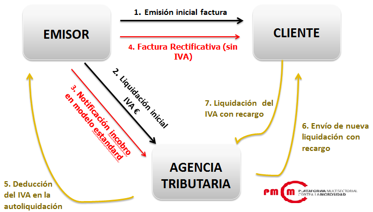 El procedimiento consiste en que el emisor emite su factura en el momento de realizar la operación con la repercusión del IVA correspondiente, que ingresa en la Agencia Española de Administración Tributaria (AEAT). Transcurrido un mes desde el cumplimiento del plazo máximo legal de pago sin que se haya producido el cobro de la factura, el emisor notificará este hecho a la AEAT en un modelo de declaración establecido al efecto. Simultáneamente, el emisor rectifica la factura emitida, anulando la repercusión del IVA. En la declaración del IVA subsiguiente, el emisor se deducirá el IVA previamente ingresado.Desde este momento, el cliente del emisor pasa a ser deudor de AEAT por importe equivalente al IVA de la operación, teniendo que enviar la AEAT al cliente una liquidación del IVA incrementada con un cargo del 10%.