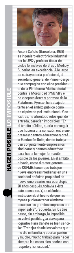 Las pymes tienen que empezar a pensar que la digitalización es una oportunidad que les puede permitir dar respuestas a pesar de haber cambiado de dimensión. Por otra parte, han de poner en valor la proximidad, porque a diferencia de lo que ocurría durante la globalización -no importaba de dónde venían los productos-, ahora hemos descubierto que tener proveedores a 6.000 km de distancia conlleva un riesgo de rotura de las cadenas de producción. Y han de pensar que su tamaño, ahora, será una ventaja, porque tendrán una mayor capacidad de adaptación. Partiendo de estos tres ejes, deberán tener una mentalidad más abierta y menos individualista; una visión mucho más interdisciplinaria a la hora de construir nuestros proyectos. Y no pueden olvidar la importancia de la competitividad y la productividad. Si tenemos empresas competitivas y productivas, podremos tener buenos empleos con buenas remuneraciones y ser un país de vanguardia. Y hemos de advertir a la sociedad, a las empresas y a los trabajadores que la formación profesional ha sido siempre importante, pero ahora se convierte en el elemento de competitividad más importante que tendremos como país. Y es flagrante que, en un momento en que necesitaremos más que nunca las políticas activas de formación, se recorten sus fondos para pagar el paro. Esto es una equivocación enorme: como ponerse en contra dirección en la autopista. La ministra de Trabajo ya dice que esta medida puede ser reversible. No hacerla así sería un error.
