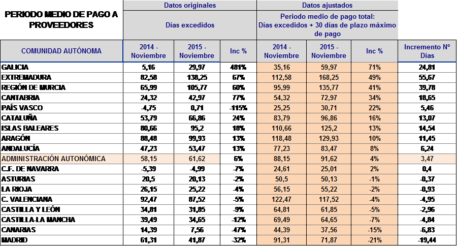*Las dos primeras columnas se refieren solo al número de días que exceden del plazo máximo legal permitido de 30 días. Las dos columnas de fondo de color salmón aluden al plazo medio de pago que deriva de sumar los 30 días de plazo máximo más los días de exceso que apunta el Ministerio de Hacienda. De este modo se explica que en los datos oficiales de algunas comunidades autónomas y ayuntamientos el plazo medio de pago publicado sea negativo, como es el caso de Navarra.