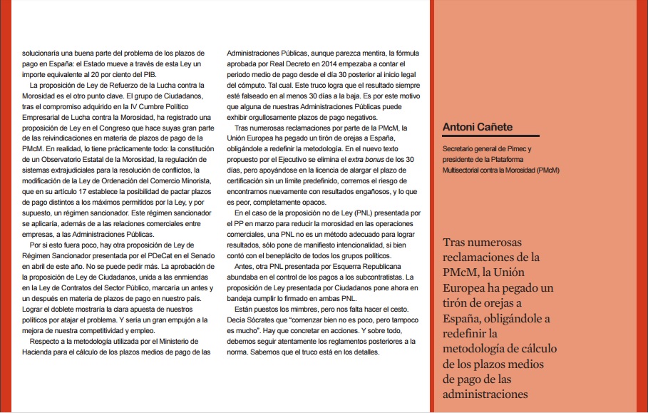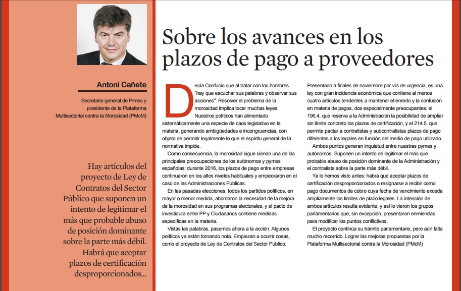 Antoni Cañete analiza la Ley de Contratos del Sector Público y la proposición de Ley de Refuerzo de la Lucha contra la Morosidad. Un doblete que sin duda, marcaría un antes y un después en materia de plazos de pago en nuestro país. Esperamos que nuestros políticos no sigan alimentando este caos legislativo que permite lo que el espíritu general de la normativa impide.